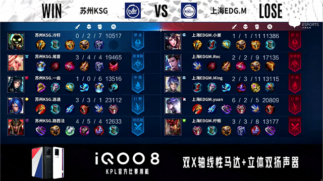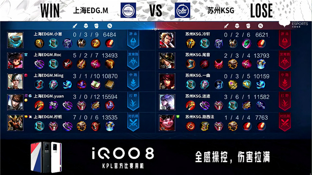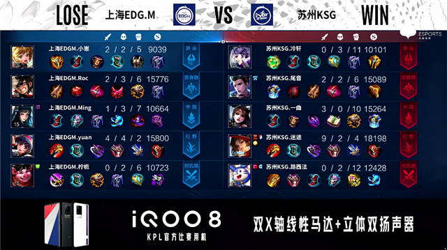2分14秒,上海EDG.M赵云抢到暴君,随后团战打出0换3,关羽拿下双杀。5分28秒,苏州KSG控下先知主宰。5分44秒,苏州KSG破掉上海EDG.M上二塔。6分53秒,双方团战1换1。7分01秒,上海EDG.M控下暴君,双方团战再次1换1。8分10秒,苏州KSG下路打出0换2。8分55秒,双方团,上海EDG.M打出0换3,关羽拿下双杀。9分25秒,上海EDG.M破掉苏州KSG中路两座外塔并控下先知主宰。10分32秒,双方团,上海EDG.M打出0换3,关羽再次拿下双杀。11分11秒,上海EDG.M破掉苏州KSG中高地,随后破掉苏州KSG上二塔。11分40秒,上海EDG.M控下暗影暴君。14分05秒,上海EDG.M破掉苏州KSG下高地。14分26秒,上海EDG.M控下暗影主宰。16分13秒,上海EDG.M控下暗影暴君。17分14秒,苏州KSG击杀盾山。18分27秒,下路团,上海EDG.M打出0换4。18分53秒,上海EDG.M击杀猪八戒后摧毁苏州KSG水晶扳回一城。