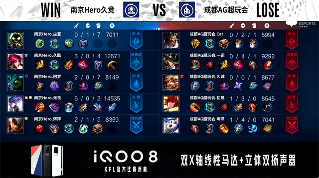 双方常规开局。1分06秒南京Hero中路击杀裴擒虎拿到一血。1分57秒双方对抗路1换1。2分18秒南京Hero拿下暴君。3分40秒成都AG拿下主宰。5分09秒南京Hero摧毁敌方发育路外塔。5分36秒双方游走在暴君处1换1。6分29秒南京Hero拿下暴君。6分49秒南京Hero中路击杀梦奇。7分05秒南京Hero中路击杀马可波罗。7分56秒南京Hero摧毁敌方对抗路二塔。8分10秒野区团战南京Hero打出0换2。8分57秒南京Hero摧毁敌方中路二塔。10分45秒南京Hero野区击杀马可波罗。11分15秒南京Hero摧毁敌方中路高地塔。11分28秒成都AG摧毁敌方对抗路高地塔。11分46秒南京Hero对抗路击杀裴擒虎。12分02秒南京Hero拿下暗影主宰。13分08秒南京Hero击杀牛魔并摧毁发育路高地塔。14分40秒高地团战南京Hero击杀马可波罗。15分02秒南京Hero摧毁敌方水晶拿下比赛。