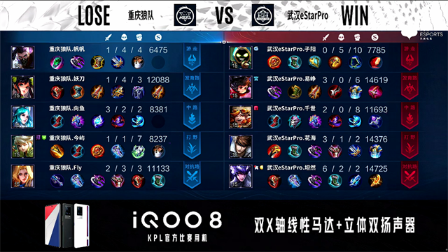 2分54秒,武汉eStar拿下暴君。3分45秒,下路团,重庆狼队打出0换2。4分40秒,重庆狼队破掉武汉eStar下一塔。5分18秒,武汉eStar拿下先知主宰。6分20秒,重庆狼队击杀云缨。6分50秒,重庆狼队破掉武汉eStar上一塔,武汉eStar击杀猪八戒。8分50秒,重庆狼队娜可露露击杀墨子。9分25秒,重庆狼队破掉武汉eStar上二塔。9分57秒,重庆狼队河道团战打出0换2。10分30秒,重庆狼队控下暗影暴君,随后团战打出1换2。12分10秒,武汉eStar百里守约击杀鲁班大师。12分45秒,武汉eStar控下暗影主宰。15分30秒,武汉eStar控下暗影暴君,随后击杀重庆狼队嬴政。15分58秒,武汉eStar破掉重庆狼队中一塔。16分14秒,武汉eStar先后破掉重庆狼队下二塔及下高地。17分04秒,武汉eStar控下暗影主宰。17分40秒,武汉eStar破掉重庆狼队上二塔。18分07秒,重庆狼队下路草丛蹲伏助队团战打出1换2。20分15 秒,武汉eStar姜子牙大闪击杀嬴政。20分40秒,武汉eStar控下风暴龙王,随后击杀猪八戒。21分10秒,武汉eStar破掉重庆狼队中、上两座高地。21分33秒,武汉eStar高地团打出0换4,随后一波摧毁重庆狼队水晶拿到赛点。