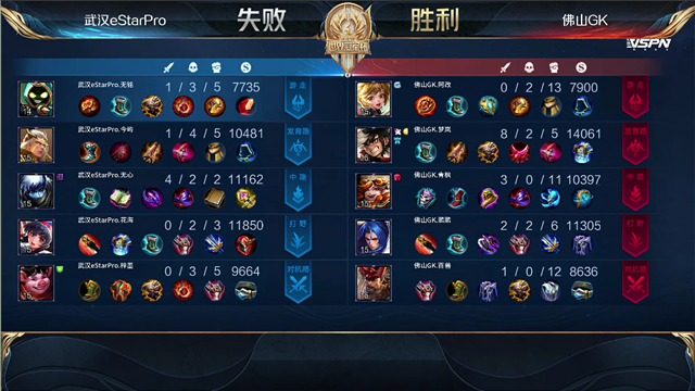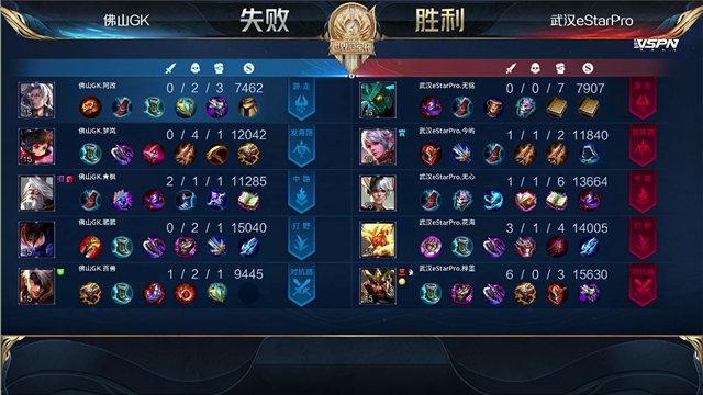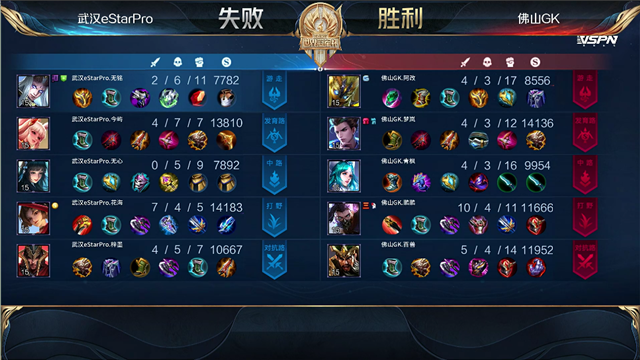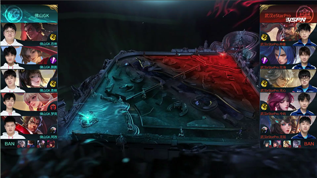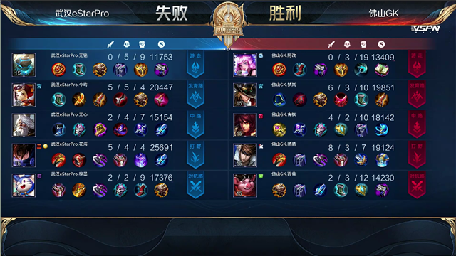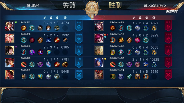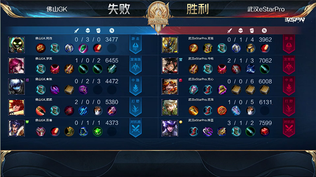 开局佛山GK入侵武汉ES野区反掉红buff。2分15秒,佛山GK拿下暴君。2分38秒,武汉ES下路包抄,太乙真人击杀孙膑拿下一血。3分钟,佛山GK蒙犽下路击杀后羿。4分13秒,佛山GK破掉武汉ES上一塔。4分34秒,佛山GK击杀猪八戒。6分40秒,佛山GK破掉武汉ES中一塔。7分钟,佛山GK越高地击杀后羿,随后推掉武汉ES上高地塔。7分28秒,佛山GK拿下先知主宰。8分34秒,佛山GK破掉武汉ES下二塔。8分54秒,佛山GK破掉武汉ES下高地塔。9分06秒,武汉ES中路反打打出0换2,随后控下暴君。10分15秒,佛山GK拿下暗影主宰。11分51秒,佛山GK强推掉武汉ES中高地。12分57秒,佛山GK拿下暗影暴君。12分46秒,下路团,双方3换3。14分38秒,佛山GK拿下暗影主宰。15分30秒,佛山GK打出0换2。16分13秒,佛山GK下路击杀太乙真人。17分05秒,佛山GK团灭对手,随后摧毁掉武汉ES水晶扳回一城。
