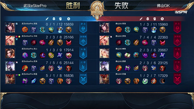 1分57秒,河道团,武汉ES打出1换4,梓墨廉颇拿下双杀。5分钟,佛山GK反打打出0换2。5分32秒,佛山GK破掉武汉ES中一塔。5分59秒,武汉ES击杀梦岚公孙离。7分29秒,双方下路团战1换1。9分34秒,佛山GK破掉武汉ES上高地,武汉ES破掉佛山GK下高地。11分15秒,武汉ES拿下暗影暴君,佛山GK拿下暗影主宰。11分57秒,武汉ES破掉佛山GK上二塔。13分47秒,武汉ES破掉佛山GK中一塔。15分30秒,中路团,武汉ES击杀嫦娥,随后控下暗影暴君。17分06秒,武汉ES拿下暗影主宰。18分17秒,武汉ES破掉佛山GK中二塔。21分13秒,佛山GK击杀廉颇。22分08秒,武汉ES击杀大乔随后控下风暴龙王。22分54秒,武汉ES破掉佛山GK中、下高地,但佛山GK击杀镜。24分钟,双方团战1换1。27分38秒,佛山GK打出1换3。28分20秒,佛山GK破掉武汉ES中高地。30分34秒,河道团,双方1换1。33分43秒,佛山GK打出0换2。34分52秒,武汉ES廉颇抢到风暴龙王。35分37秒,武汉ES赢下高地团战并摧毁佛山GK水晶赢下比赛!