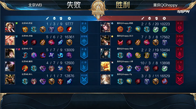 开局北京WB入侵敌方野区,团战重庆QG打出1换3。3分59秒中路下河道团战北京WB击杀戴巧。4分19秒北京WB摧毁敌方下路外塔。4分27秒北京WB拿下暴君。5分09秒双方上路1换1。6分24秒重庆QG拿下主宰。6分55秒双方上路2换2。7分20秒北京WB摧毁敌方中路外塔。8分20秒中路团战北京WB打出0换2。8分52秒北京WB拿下暴君。8分55秒北京WB摧毁敌方中路二塔。9分44秒北京WB摧毁敌方下路二塔。10分28秒北京WB拿下暗影暴君。10分48秒野区团战重庆QG打出0换2。11分07秒重庆QG摧毁敌方中路外塔。11分22秒重庆QG暴君处击杀兰陵王。11分36秒重庆QG拿下暗影主宰。12分42秒北京WB中路击杀马可波罗。13分04秒北京WB打出2换4。15分06秒中路团战重庆QG打出2换3。16分02秒野区团战重庆QG打出1换2。16分46秒重庆QG拿下暗影暴君。17分58秒重庆QG拿下暗影主宰。19分39秒重庆QG中路击杀兰陵王。20分33秒野区团战重庆QG打出1换3。21分17秒重庆QG摧毁敌方下路高地塔。21分40秒重庆QG拿下风暴龙王。22分45秒重庆QG摧毁敌方中、上高地塔。23分整高地团战重庆QG打出0换4。23分15秒重庆QG摧毁敌方水晶拿下比赛。