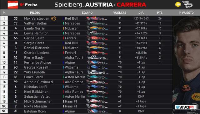2021F1奥地利大奖赛正赛最终成绩: