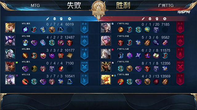 2分05秒MTG镜击杀盘古拿下一血,2分59秒MTG拿下暴君。4分54秒MTG拆掉广州TTG下路一塔,5分10秒中路团广州TTG打出1换3,6分钟广州TTG拆掉MTG下路一塔。7分钟团战广州TTG打出1换3,7分20秒广州TTG击杀司空震。8分59秒广州TTG击杀镜,10分16秒团战广州TTG打出0换2,10分26秒广州TTG拆掉MTG中路一塔。11分钟团战MTG击杀盘古,12分50秒MTG拿下暗影暴君,团战广州TTG打出1换2。14分37秒广州TTG击杀镜,14分56秒广州TTG拆掉MTG中路二塔。15分09秒广州TTG打出0换2,拆掉MTG中路高地。16分30秒团战广州TTG打出2换4,MTG仅剩孙膑一人无力防守,广州TTG一波拆掉水晶拿下胜利。