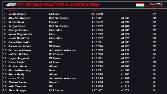 jrs直播网讯 北京时间7月19日,F1匈牙利站二练结束,诺里斯全场最快,维斯塔潘、赛恩斯位居二、三,勒克莱尔上墙退赛,周冠宇遭佩雷兹阻挡后轮胎损坏,无有效软胎成绩,位居垫底。