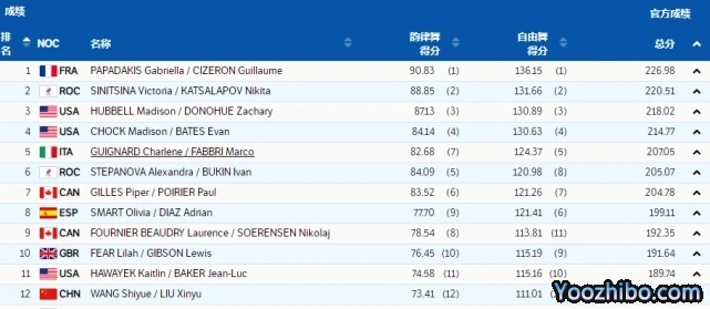jrs直播网讯2月14日讯 2022年北京冬奥会在首都体育馆进入到正赛第10个比赛日的争夺,在万众瞩目的冰舞自由舞项目的比赛当中,中国组合王诗玥/柳鑫宇总成绩排名第12位,创造中国冰舞运动员在冬奥会历史上的最好成绩,平昌冬奥会亚军、世锦赛四冠王帕帕达基斯/西泽龙总成绩226.98分刷新世界纪录夺得冠军,斯尼特斯娜/卡特萨拉波夫和美国组合胡贝尔/唐诺修分别获得银牌和铜牌。