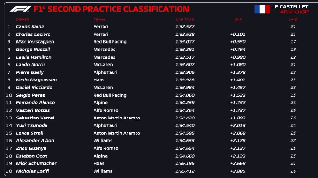 jrs直播网讯 北京时间07月23日,2022年F1法国大奖赛第2次练习赛在保罗-里卡德赛道结束。法拉利车手包揽了圈速前两位,塞恩斯最终以1:32.527排名第一,勒克莱尔落后0.101秒排名第二,红牛车队维斯塔潘落后0.550秒排名第三,拉塞尔和汉密尔顿分列四五。排名六至十位的车手分别是诺里斯、加斯利、马格努森、里卡多、佩雷兹。中国车手周冠宇名列第17位。