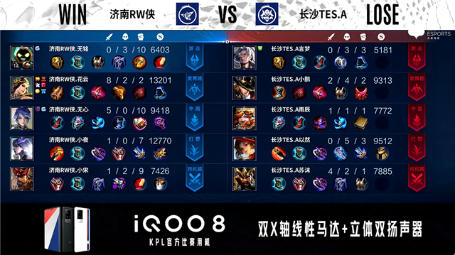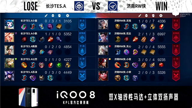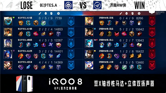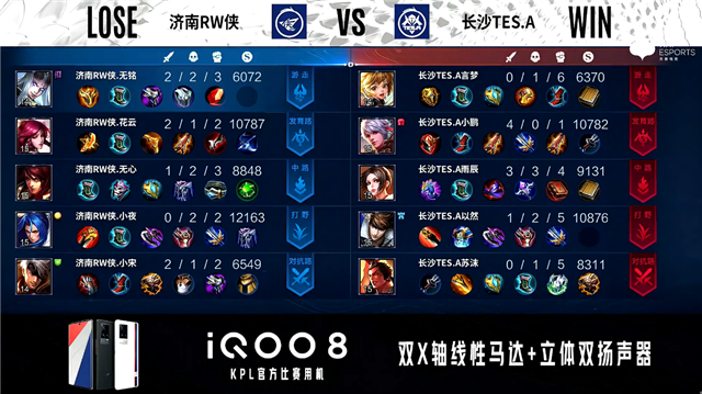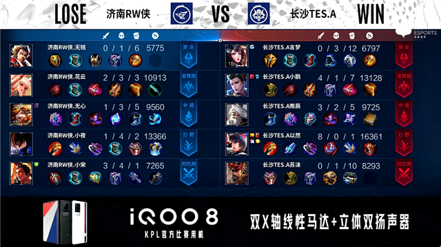 双方常规开局。1分47秒长沙TES.A中路击杀周瑜拿到一血。2分10秒长沙TES.A拿下主宰。2分24秒双方对抗路1换1,发育路济南RW侠击杀孙膑。7分13秒济南RW侠摧毁敌方中路外塔。8分26秒济南RW侠中路击杀赵云。9分32秒济南RW侠摧毁敌方发育路二塔。12分45秒济南RW侠主宰处击杀不知火舞。13分35秒济南RW侠拿下暗影主宰。14分35秒济南RW侠野区击杀不知火舞。15分05秒长沙TES.A野区击杀东皇太一。15分36秒中路团战长沙TES.A打出0换4。16分22秒长沙TES.A团灭对手摧毁水晶拿下比赛。