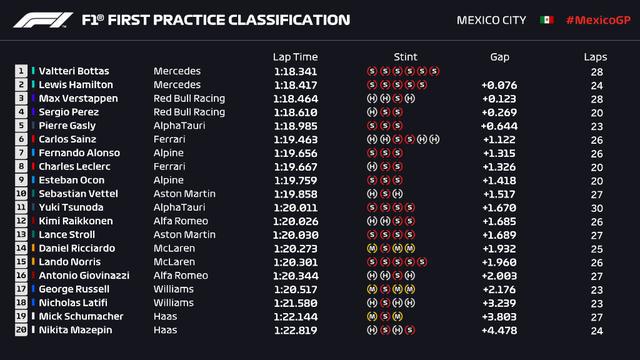 最终,一练停表!博塔斯以1:18.341排名一练第一,汉密尔顿落后0.076秒排名第二,维斯塔潘落后0.123秒排名第三。主场车手佩雷兹排名第四,加斯利排名第五。排名六至十位的车手分别是塞恩斯、阿隆索、勒克莱尔、奥康、维特尔。