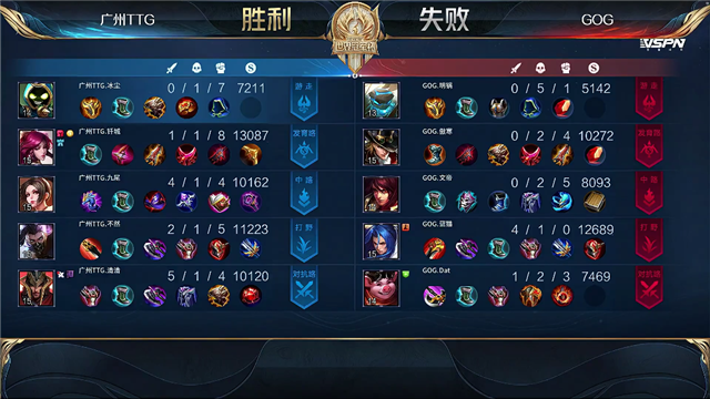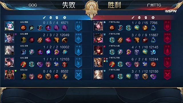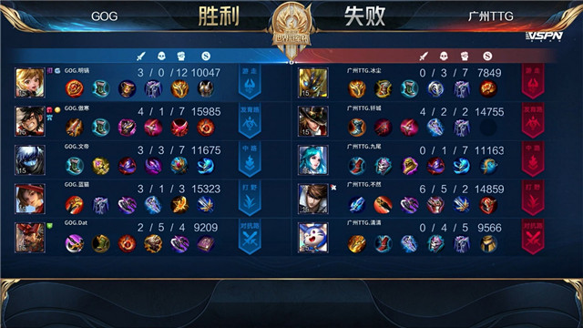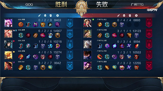 1分55秒上路团,广州TTG打出0换2。2分21秒广州TTG拿下暴君,双方1换1。4分39秒GOG拆到广州TTG下路一塔,4分53秒中路团GOG击杀不知火舞。5分52秒GOG击杀公孙离,拆掉广州TTG上路一塔。6分54秒团战双方1换1,8分50秒中路团双方1换1。9分15秒GOG击杀广州TTG公孙离,10分11秒GOG拿下暗影暴君,10分27秒广州TTG拿下暗影主宰。11分02秒团战GOG打出0换2拆掉广州TTG中路二塔。14分42秒GOG拿下暗影暴君,15分48秒广州TTG拆掉GOG下路二塔。16分钟上路团双方打出2换2,17分49秒GOG拆掉广州TTG下路高地。20分35秒团战双方1换1,21分54秒GOG击杀广州TTG公孙离,拿下风暴龙王。22分26秒GOG拆掉广州TTG上路高地,一波拆掉其水晶拿下胜利!