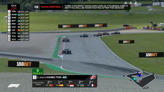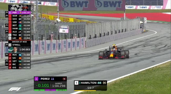 随后加斯利做出一圈1分04秒429,挤掉维斯塔潘,暂时排在第一。而博塔斯和诺里斯也分别做出了比佩雷斯更快的圈速,佩雷斯掉到了第五。