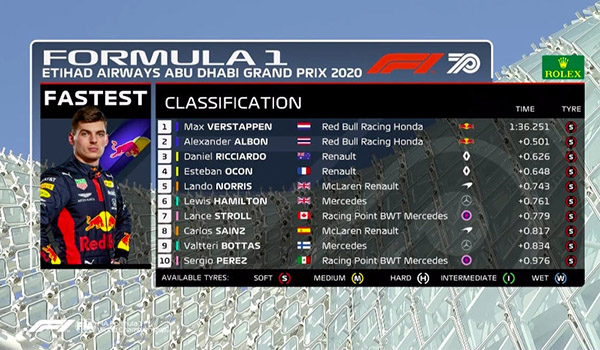 jrs直播网讯:北京时间12月12日晚,结束了F1阿布扎比大奖赛第三次练习赛,维斯塔潘做出1:36.251的最快单圈,排名第一,队友阿尔本第二,慢了半秒。雷诺车队的两位车手里卡多和奥康紧随其后,诺里斯第五,汉密尔顿第六;斯托尔、塞恩斯、博塔斯、佩雷兹分列七至十位。