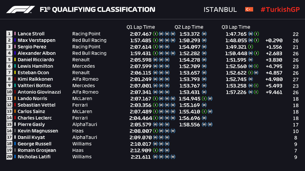 jrs直播网讯:北京时间11月14日,2020赛季F1世界锦标赛土耳其大奖赛排位赛在伊斯坦布尔公园赛道落下帷幕。周六的第三次自由练习赛迎来了较大的降雨,所有车手都显得有些无所适从。雨势到了排位赛略微减小,但是赛道表面的抓地力还是非常糟糕,排位赛由此在极度潮湿的状态下开始,多数车手都发生了打滑的情况。最终,兰斯-斯托尔(Lance Stroll)代表赛点车队时隔十一年破天荒地拿下了杆位,这是加拿大人职业生涯的首个杆位。此前一直被看好的马克思-维斯塔潘(Max Verstappen)最后关头没有能够提升成绩,和队友亚历山大-阿尔本(Alexander Albon)分获第二和第四的发车位。