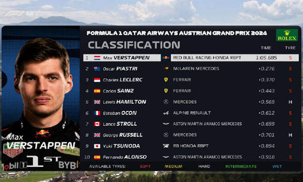 jrs直播网讯 北京时间06月28日晚,2024F1奥地利大奖赛, 一练最终成绩: