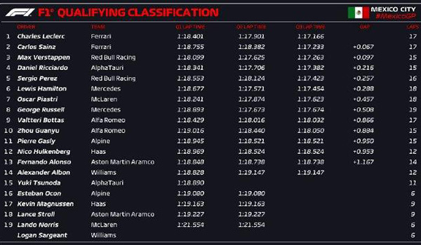 jrs直播网讯 北京时间10月29日,2023年F1墨西哥城大奖赛排位赛结束,勒克莱尔获得杆位,这也是他职业生涯的第22个杆位;他的队友塞恩斯第二,法拉利车队包揽了正式比赛头排发车位。红牛车队的维斯塔潘排名第三,小红牛车队里卡多第四,主场作战的佩雷兹第五。汉密尔顿、皮亚斯特里、拉塞尔、博塔斯以及中国车手周冠宇分列六至十位。
