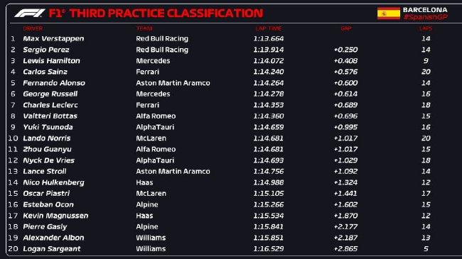 最终,红牛车队维斯塔潘凭借1:13.664的成绩取得三练头名,这一成绩要比昨天他的最快圈速更快。他的队友佩雷兹和梅赛德斯车队汉密尔顿分列二三位。第四至第十分别是塞恩斯、阿隆索、拉塞尔、勒克莱尔、博塔斯、角田裕毅和诺里斯。中国车手周冠宇第11位。萨金特在比赛中撞车一度引发红旗。