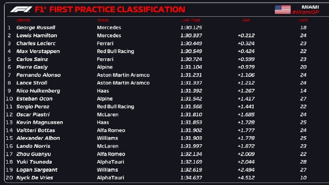 jrs直播网讯 北京时间05月06日,2023年F1迈阿密大奖赛第1次练习赛结束,梅赛德斯车队拉塞尔以1:30.125排名第一,他的队友汉密尔顿落后0.212秒排名第二,法拉利车队勒克莱尔落后0.324秒排名第三。维斯塔潘和塞恩斯分列四五位,排名六至十位的车手分别是加斯利、阿隆索、斯托尔、霍肯伯格、奥康。