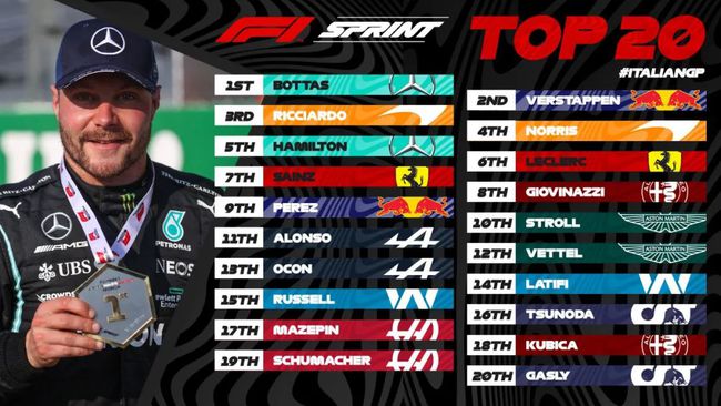 博塔斯一路领跑拿到排位冲刺赛第一,维斯塔潘和里卡多在发车后抢到第二和第三,并凭借稳定的发挥守住名次。汉密尔顿发车失误,最终获得第五。积分方面,博塔斯拿到3分,维斯塔潘收获2分,里卡多获得1分。