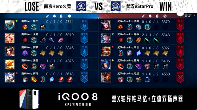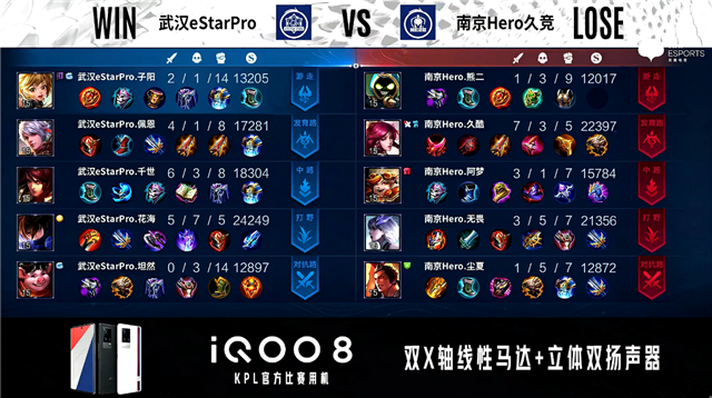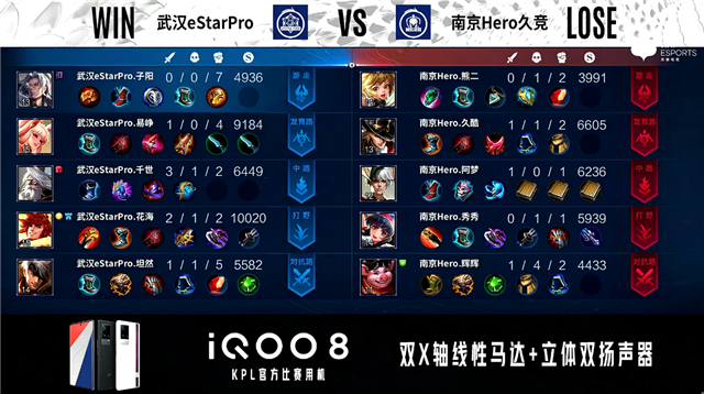 开局南京Hero公孙离中路抢线,武汉eStar边路换线。1分45秒南京Hero对抗路击杀狄仁杰拿到一血。2分18秒武汉eStar野区击杀盾山。2分35秒武汉eStar拿下主宰。3分16秒武汉eStar对抗路击杀公孙离。4分12秒武汉eStar摧毁敌方发育路外塔。4分26秒武汉eStar拿下暴君。5分17秒武汉eStar摧毁敌方对抗路二塔。6分06秒武汉eStar摧毁敌方中路外塔。6分18秒武汉eStar对抗路打出0换2。6分48秒武汉eStar摧毁敌方中路二塔。6分55秒武汉eStar摧毁敌方发育路二塔。7分19秒武汉eStar拿下主宰。7分54秒武汉eStar摧毁敌方对抗路、中路高地塔。8分09秒武汉eStar摧毁敌方水晶拿下比赛。