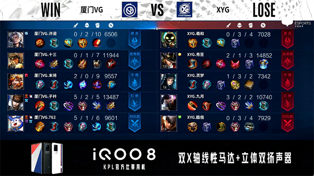 双方常规开局。1分05秒XYG拿下中路河道之灵。2分45秒中路团战XYG击杀盾山拿到一血。3分42秒XYG拿下暴君。6分49秒双方边路外塔互换。9分06秒中路团战XYG打出1换3。10分18秒厦门VG摧毁敌方中路外塔。14分11秒中路团战厦门VG击杀东皇太一。14分37秒厦门VG拿下暗影主宰。15分01秒双方野区2换2。16分37秒XYG抢到暗影暴君,团战厦门VG打出1换2。17分23秒厦门VG摧毁敌方对抗路高地塔。17分32秒厦门VG摧毁敌方中路高地塔。18分51秒中路团战XYG打出3换4,关羽拿到三连决胜。21分20秒对抗路团战XYG打出1换2。22分02秒XYG拿下暗影暴君。22分16秒XYG摧毁敌方中路外塔。22分68秒高地团战XYG打出0换2并摧毁发育路高地塔。23分41秒XYG摧毁敌方中路高地塔。26分18秒龙王处团战厦门VG打出1换2。27分17秒厦门VG拿下风暴龙王。28分09秒厦门VG摧毁敌方发育路高地塔。28分43秒高地团战双方1换1。29分29秒高地团战厦门VG打出3换4,厦门VG虞姬打出四连超凡。30分05秒厦门VG摧毁敌方水晶拿下比赛。