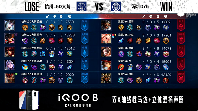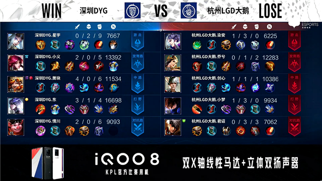 双方常规开局。1分01秒杭州LGD大鹅发育路击杀牛魔拿到一血。2分24秒深圳DYG拿下暴君。3分24秒深圳DYG中路击杀露娜。3分32秒杭州LGD大鹅摧毁敌方发育路外塔。3分42秒中路下河道团战深圳DYG打出0换2。4分52秒深圳DYG拿下主宰。5分21秒双方中路1换1。6分31秒深圳DYG对抗路击杀东皇太一。7分56秒双方发育路1换1,深圳DYG摧毁敌方发育路二塔。8分23秒杭州LGD大鹅摧毁敌方中路外塔。9分30秒中路团战深圳DYG打出0换2。12分07秒深圳DYG拿下暗影主宰。13分38秒深圳DYG发育路击杀露娜。14分06秒深圳DYG摧毁敌方中路二塔。14分41秒深圳DYG拿下暗影暴君。16分21秒对抗路团战杭州LGD大鹅打出0换2。18分12秒深圳DYG野区击杀廉颇。18分59秒深圳DYG拿下暗影暴君。20分46秒野区团战深圳DYG打出2换4。21分38秒深圳DYG摧毁水晶拿下比赛。