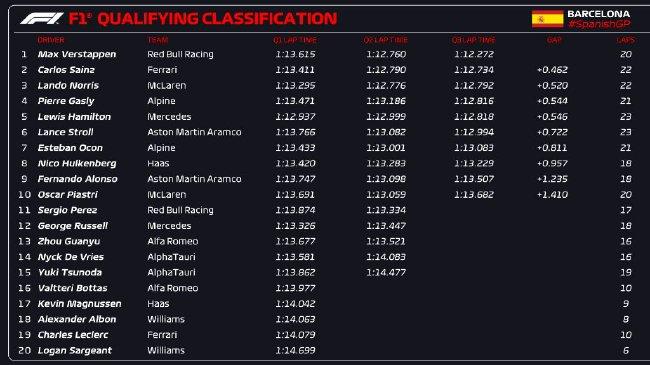 jrs直播网讯 2023年F1西班牙大奖赛排位赛在巴塞罗那赛道结束。红牛车队维斯塔潘凭借Q3第一个飞驰圈的表现,以0.462秒的优势毫无悬念地拿到赛季第4个杆位,法拉利车队塞恩斯第二,迈凯伦车队诺里斯第三!