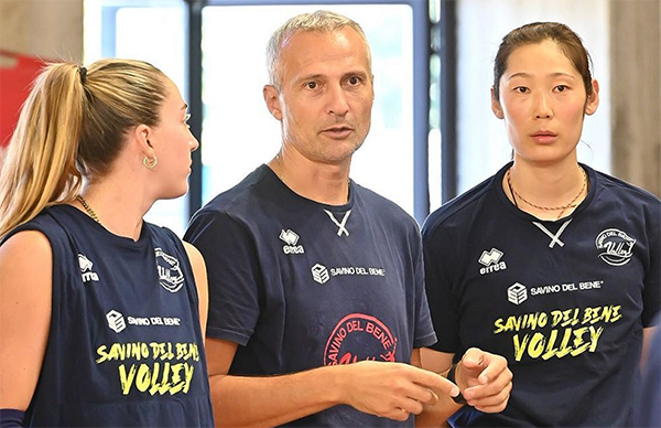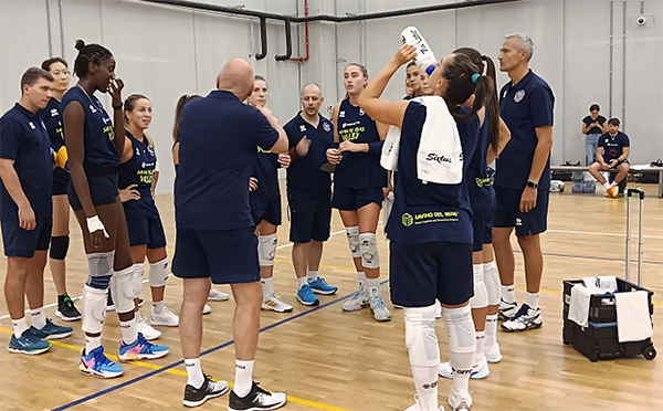 斯坎迪奇进行季前赛前的第二次集训,和佛罗伦萨进行测试训练,因为有部分球员参加奥资赛,还没有归队,所以只能从二队征调一些球员加入。可以看到朱婷戴着护具,耐心地听着教练的讲话。