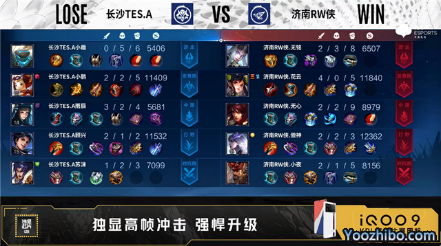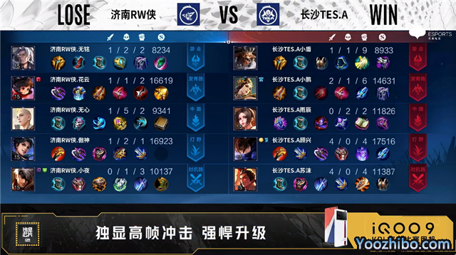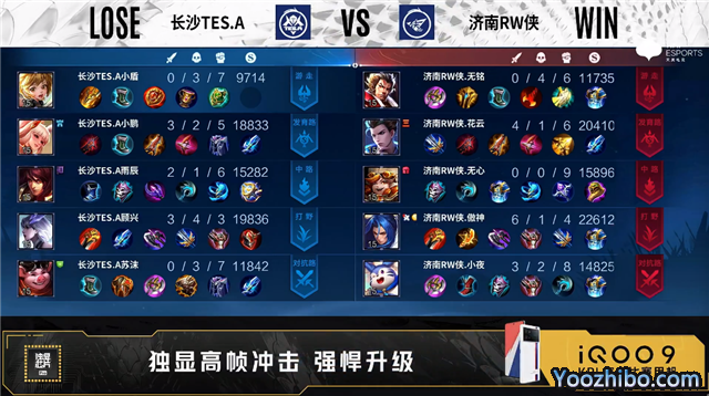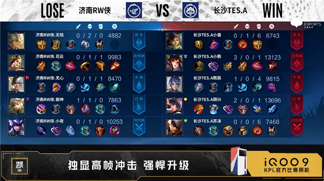 开局济南RW侠李元芳中路抢线。2分28秒长沙TES.A发育路击杀金蝉拿到一血。5分22秒济南RW侠中路击杀不知火舞。7分38秒济南RW侠拿下暴君。9分36秒长沙TES.A中路击杀金蝉。10分13秒济南RW侠拿下暗影主宰。10分21秒长沙TES.A中路击杀金蝉。12分20秒长沙TES.A中路击杀曜。14分01秒中路团战长沙TES.A打出0换2。14分23秒长沙TES.A摧毁敌方中路外、二塔。15分51秒长沙TES.A拿下暗影暴君。16分23秒长沙TES.A摧毁敌方发育路二塔。17分30秒济南RW侠野区击杀虞姬。17分47秒济南RW侠摧毁敌方中路二塔。22分35秒中路团战长沙TES.A打出1换4。23分05秒长沙TES.A团灭对手摧毁水晶拿下比赛。