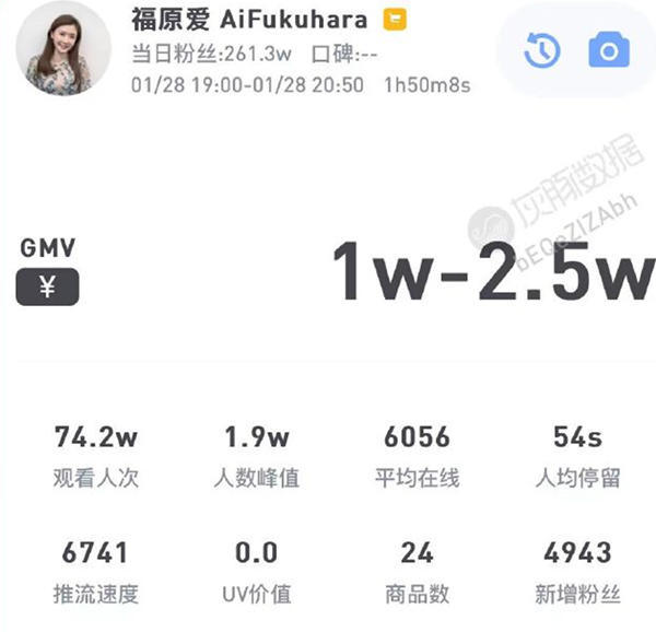 到了28日晚上,福原爱开播带货,可惜在2个小时的直播中,福原爱的带货数据惨淡,根据数据显示,卖出了不到2.5万元,成交数商品为2375件,平均单价不足100元,这对于一个拥有数百万粉丝的福原爱来说,是很尴尬的数据。