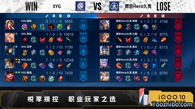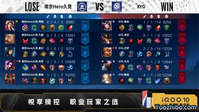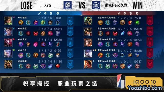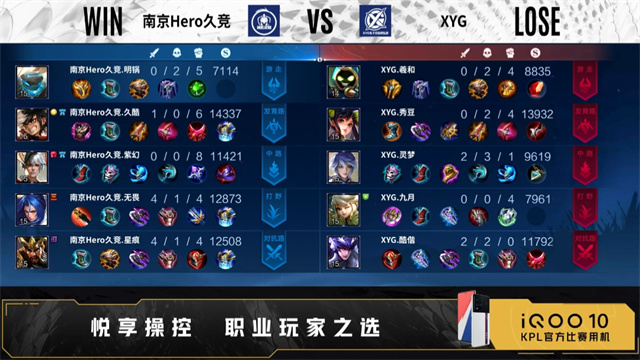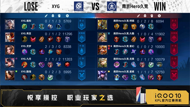 开局双方正常抢线。2分37秒河道南京Hero久竞击杀铠,拿下一血。3分40秒南京Hero久竞拿下主宰。4分37秒河道团战南京Hero久竞击杀桑启,打出1换2,XYG摧毁敌方发育路外塔。5分51秒中路南京Hero久竞击杀桑启,摧毁敌方对抗路外塔,XYG摧毁敌方中路外塔,拿下暴君。7分15秒野区团战南京Hero久竞击杀关羽,双方打出2换2,南京Hero久竞拿下主宰。8分24秒XYG摧毁敌方对抗路外塔,南京Hero久竞摧毁敌方发育路外塔。9分29秒暴君出南京Hero久竞击杀关羽。10分21秒南京Hero久竞拿下暗影主宰,XYG拿下暗影暴君,击杀镜,摧毁敌方中路二塔。12分48秒XYG摧毁敌方对抗路二塔,南京Hero久竞摧毁敌方发育路二塔。14分31秒中路XYG击杀镜,摧毁敌方中路高地。15分31秒野区XYG击杀镜,摧毁敌方对抗路高地。17分18秒野区团战南京Hero久竞击杀狄仁杰,打出0换1。18分15秒南京Hero久竞拿下暗影主宰。19分20秒野区南京Hero久竞击杀铠,摧毁敌方发育路高地,打出3换5,团灭对手摧毁水晶拿下比赛。