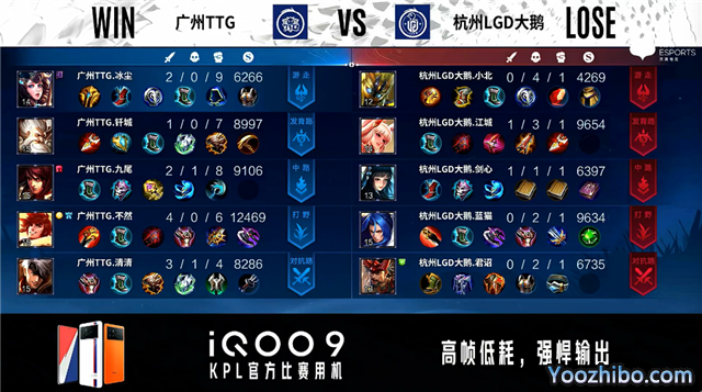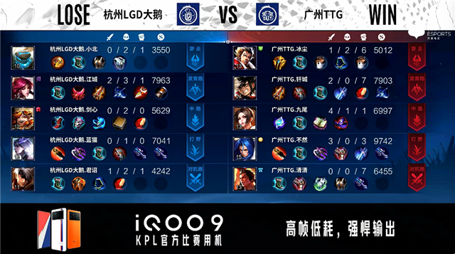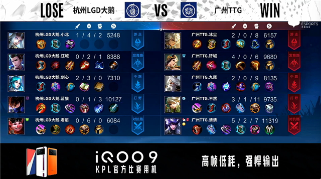 双方常规开局。1分13秒中路团战广州TTG打出1换2,杭州LGD大鹅拿到一血。2分32秒杭州LGD大鹅拿下主宰。2分45秒广州TTG拿下暴君。3分45秒中路团战广州TTG击杀鬼谷子。6分47秒杭州LGD大鹅摧毁敌方中路外塔。7分32秒广州TTG野区击杀公孙离并摧毁敌方对抗路二塔。8分35秒广州TTG中路上河道击杀廉颇。8分45秒广州TTG摧毁敌方中路外塔。10分16秒广州TTG拿下暗影暴君。11分33秒广州TTG摧毁敌方中路、发育路二塔。12分58秒广州TTG拿下暗影主宰。13分05秒广州TTG摧毁敌方对抗路高地塔。13分31秒野区团战双方1换1。13分46秒广州TTG高地击杀西施。13分58秒高地团战广州TTG团灭对手。14分19秒广州TTG摧毁敌方水晶拿下比赛。