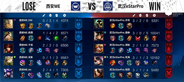 2分20秒上路团战,吕布拿下一血。3分钟镜拿下暴君。3分55秒澜拿下主宰。4分10秒主宰团,武汉eStarPro打出0换2。5分钟河道团战,武汉eStarPro打出0换2。5分24秒澜推掉下路一塔。7分钟镜被击杀。8分钟澜拿下暴君。8分10秒下路团战,武汉eStarPro打出2换3。9分17秒镜拿下主宰。9分40秒下路团战,西安WE打出0换2。10分钟马可波罗推掉中路一塔。10分17秒澜拿下暴君。10分30秒中路团战,西安WE打出0换2。11分26秒澜拿下主宰,团战双方3换3。12分40秒上路团战,武汉eStarPro打出0换2。14分20秒镜拿下暴君,团战武汉eStarPro打出1换3。14分59秒吕布推掉中路一塔。15分24秒镜拿下主宰。18分钟镜拿下暴君。19分钟上路团战,武汉eStarPro打出1换5团灭西安WE。20分钟武汉eStarPro推掉水晶追回一分。