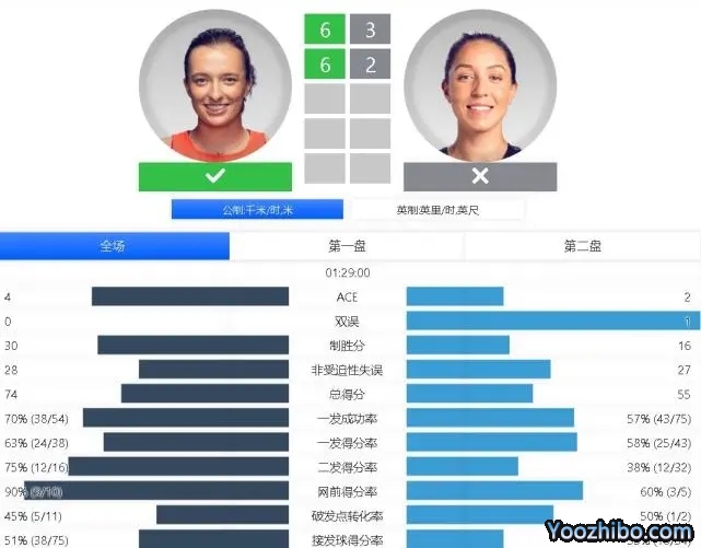 首盘斯维亚泰克一上来就破发成功,第2局她错失40-0的领先,被佩古拉连拿5分完成回破。第7局斯维亚泰克再次破发,随后她保发取得5-3的优势。第9局佩古拉发球局再次失守,斯维亚泰克破发之后6-3赢下第一盘。