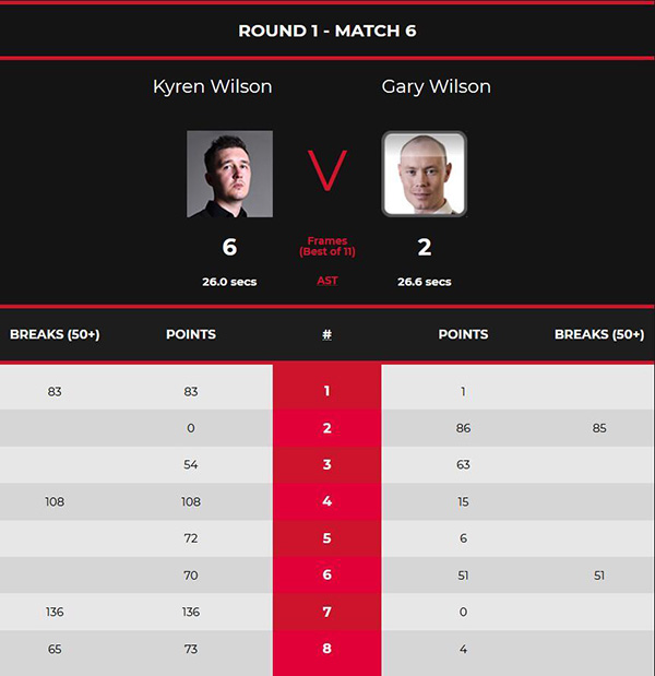 首局比赛中,加里威尔逊率先打进一杆长台,但没能叫位到彩球转入防守,随后威尔逊在长台寻找到机会,上手后围球打出单杆83超分制胜1-0领先。第2局比赛中,依旧是加里威尔逊率先拼进长台,随后做出一杆高质量防守,威尔逊解球失误漏出机会,加里威尔逊再度上手打出单杆85分制胜,总分来到1-1平。