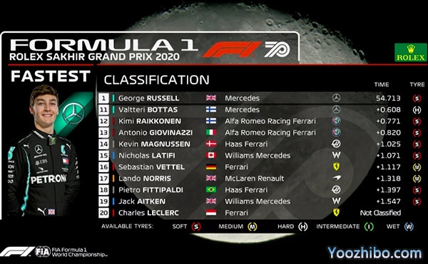 长距离对比方面,大车队的成绩基本上都是在58秒出头,拉塞尔的圈速基本上要比队友慢上0.2-0.3秒左右。但是考虑到所有人的载油量不同,因此没有特别大的参考价值。与此同时,博塔斯还是一直在因为8号弯的赛道限制被取消成绩,拉塞尔也多次遇到同样的问题。最终,拉塞尔以54.713的成绩再度领先二练,维斯塔潘以微弱优势拿下第二,佩雷兹排在第三。