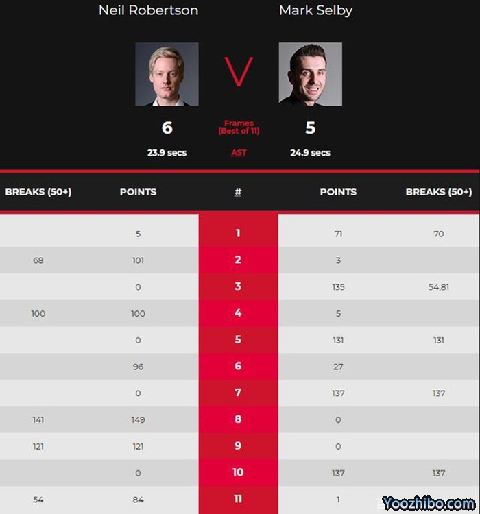 第9局,尼尔·罗伯逊再打出121分零封马克·塞尔比,这杆破百是尼尔·罗伯逊本场赛事的第3杆破百,成功将比分反超为5-4,并率先拿到赛点。第10局,马克·塞尔比再输即出局,以顽强和逆转出名的塞尔比随即打出137分零封尼尔·罗伯逊,把比分改写成5-5,将比赛拖入决胜局。这是双方本场比赛连续第5次交替战平,实在是太精彩。最后的第11局,双方打得都非常谨慎,最后还是尼尔·罗伯逊笑到了最后,以84-1的比分获胜,以总比分6-5淘汰马克·塞尔比,成功进入决赛。