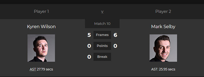 第9局,双方围绕最后一颗红球展开多回合防守,威尔逊摔袋后“助攻”对手完成超分,随后,塞尔比在时隔20分钟以上再次得分,4-5挽救一个赛点。第10局,威尔逊在防守中率先开散球堆,意图速战速决却适得其反,塞尔比率先上手建立优势,并最终取胜,追至5-5。决胜局,威尔逊勇猛的选择带旋转进攻底袋红球,却为塞尔比留下了第二次上手机会,塞尔比一杆74分完成超分,在一场耗时5小时的鏖战中,完成了从0-4到6-5的大逆转。