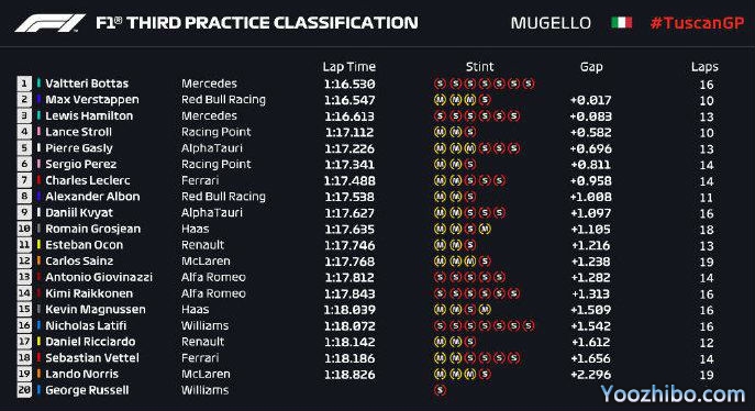 2020F1托斯卡纳大奖赛在意大利的穆杰罗赛道进行周六第三次练习赛。梅赛德斯车队博塔斯最快,红牛车队维斯塔潘第二,梅赛德斯车队汉密尔顿第三。迈凯伦和雷诺车队比较意外的没能进入前十名。