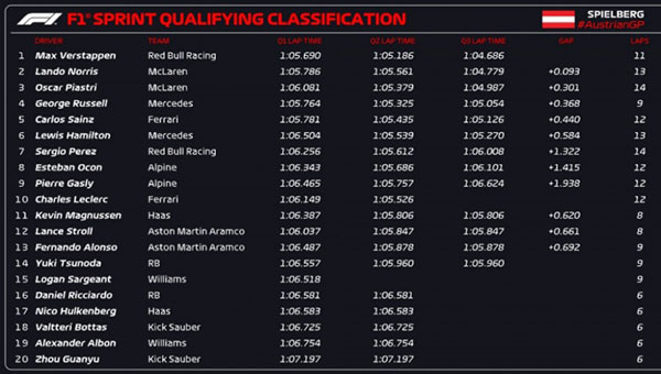 jrs直播网讯 北京时间6月28日,F1奥地利大奖赛结束冲刺排位赛争夺,红牛车队车手维斯塔潘以0.093秒的优势战胜诺里斯,夺得杆位。两人将在明天的冲刺赛中头排发车,皮亚斯特里排名第三。