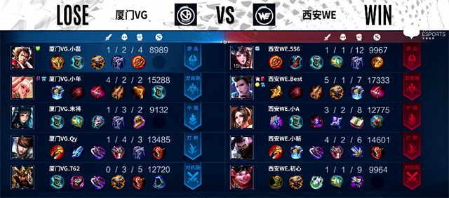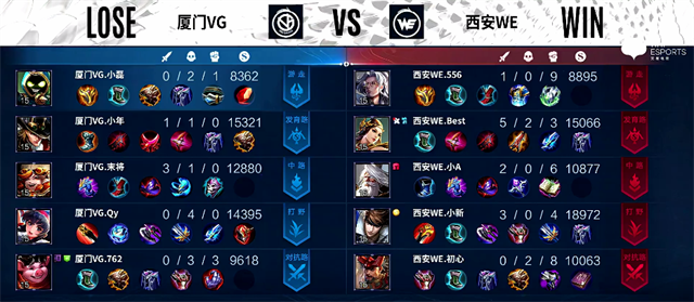 双方和平开局。1分钟西安WE入侵野区,赵云拿下一血。2分16秒赵云拿下暴君。3分10秒娜可露露被击杀。4分20秒赵云拿下主宰。4分50秒厦门VG下路一塔被破。5分40秒双方互换边路一塔。5分30秒野区团战,廉颇被击杀。5分40秒虞姬推掉中路一塔。6分钟赵云拿下暴君。8分钟赵元拿下主宰。10分40秒娜可露露推掉上路一塔。11分钟沈梦溪被击杀。11分20秒娜可露露拿下主宰,赵云拿下暴君。14分47秒西安WE强攻下路高地塔,太乙真人被击杀。15分钟西安WE推掉中路高地塔,团战打出1换2。16分50秒赵云拿下暴君。17分52秒厦门VG上路高地塔被破。20分20秒风暴龙王团,猪八戒被击杀。21分钟野区团战,西安WE打出2换4。21分52秒西安WE推掉水晶率先拿下一分。