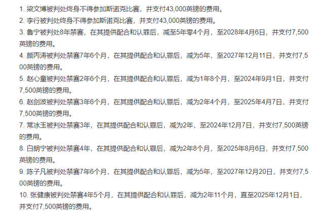 从最终的处罚结果来看,梁文博和李行被纪律委员会认定为“那些试图腐蚀斯诺克运动的人”,“招揽、诱导、引诱、劝说、怂恿或协助其他球员”。很显然,这两人是这次假球案中的首犯,他们也得到了应有的处理。其余的8人,鲁宁被禁赛5年4个月,颜丙涛和陈子凡被禁赛5年,赵剑波、常冰玉、白朗宁、张健康和赵心童的禁赛都在3年以下。这8人全部参与了非法活动,但他们都配合了调查。