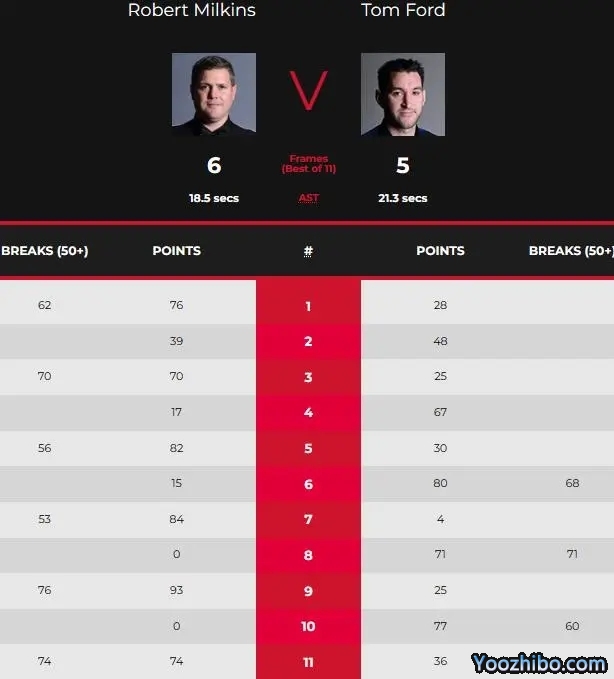 中场休息回来,第五局卡特轰出单杆107分,第六局特鲁姆普打出单杆57分,第七局特鲁姆普以59-48赢得缠斗,第八局卡特打出单杆58分,第九局特鲁姆普打出单杆61分,率先拿到赛点,卡特回敬单杆96分,决胜局卡特打出单杆53分以85-56结束比赛,6-5逆转特鲁姆普。
