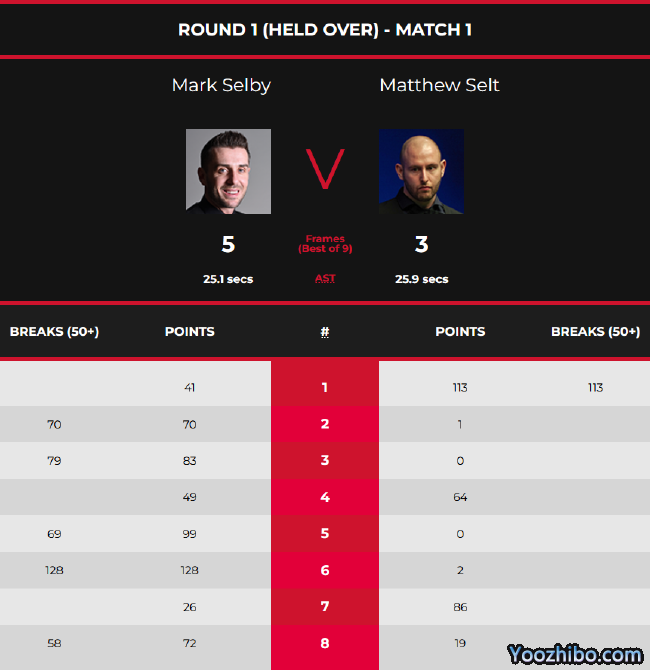 作为欧洲大师赛的卫冕冠军,世界第一塞尔比参加本次比赛,他期待能够强势反弹。第一轮,世界第一的对手,是世界排名第第28位的马修-塞尔特。塞尔比与塞尔特总共有9次交锋记录,战绩为7胜2负,优势明显。