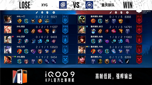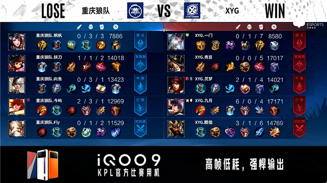 重庆狼队开局边路换线。1分05秒XYG野区击杀裴擒虎拿到一血。2分12秒XYG拿下暴君。3分39秒XYG对抗路击杀李元芳。3分57秒XYG对抗路击杀嬴政。4分04秒重庆狼队发育路击杀东皇太一。4分14秒XYG拿下主宰。5分06秒双方发育路1换1。5分40秒重庆狼队摧毁敌方发育路外塔。6分30秒XYG拿下暴君。6分48秒重庆狼队摧毁敌方对抗路外塔。7分12秒XYG摧毁敌方中路外塔。8分28秒中路团战XYG打出0换3。6分56秒XYG摧毁敌方中路二塔。10分10秒XYG拿下暗影暴君。10分52秒XYG拿下暗影主宰。13分55秒XYG拿下暗影暴君。14分44秒XYG拿下暗影主宰。15分36秒XYG摧毁敌方中路高地塔。17分10秒对抗路团战XYG打出0换2。18分36秒XYG拿下暗影主宰。19分11秒XYG摧毁敌方发育路高地塔。19分48秒XYG摧毁敌方对抗路高地塔。21分05秒XYG拿下风暴龙王。22分03秒XYG摧毁敌方水晶拿下比赛。