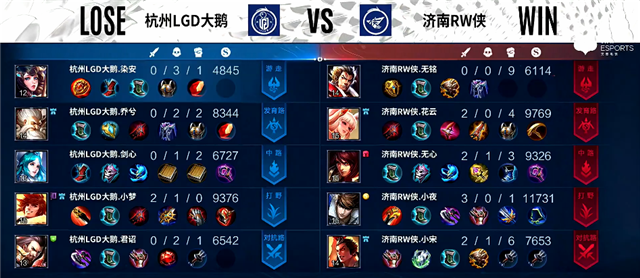 2分12秒周瑜拿下暴君。3分钟济南RW侠入侵野区,吕布拿下一血。4分钟济南RW侠入侵野区,吕布被击杀。5分40秒老夫子推掉上路一塔。6分20秒裴擒虎拿下暴君。7分45秒河道团战,济南RW侠打出0换2。8分10秒公孙离推掉中路一塔。8分27秒赵云拿下主宰。10分21秒赵云拿下暴君。11分40秒野区团战,老夫子被击杀。12分20秒赵云拿下主宰。13分35秒济南RW侠推掉中路高地塔,团战打出1换4。14分16秒济南RW侠推掉水晶拿下本场比赛胜利。