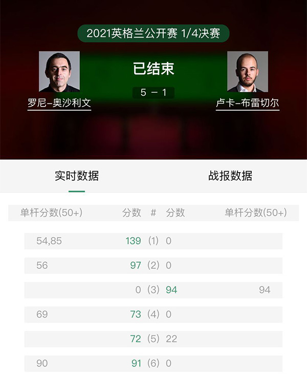 jrs直播网讯北京时间11月06日,英格兰公开赛1/4决赛,奥沙利文5-1绅士横扫布雷切尔晋级4强。比赛伊始奥沙利文便火力全开,仅用时8分钟便完成连续两杆50+,单局139-0布雷切尔气吞山河。而布雷切尔显然对于火箭开场操作打懵,第二局再次防守不到位,奥沙利文再添单杆56分2-0领先。前两局轻松获胜的火箭稍有放松,第三局小角度拼中袋不中漏下绝佳机会,平静呼吸的布雷切尔轰出单杆94分还以颜色。随后布雷切尔又一次第一杆便漏球,火箭一杆致命3-1进入中场休息。下半场布雷切尔一杆超级大翻袋上手,但随后再次失误送机会,奥沙利文围球33分后贴库红球不中留下袋口,面对大好球形“比利时子弹”再次薄球失误,奥沙利文接管一杆制胜拿到赛点。大比分落后的布雷切尔没了心气,奥沙利文乘胜追击5-1大胜布雷切尔。