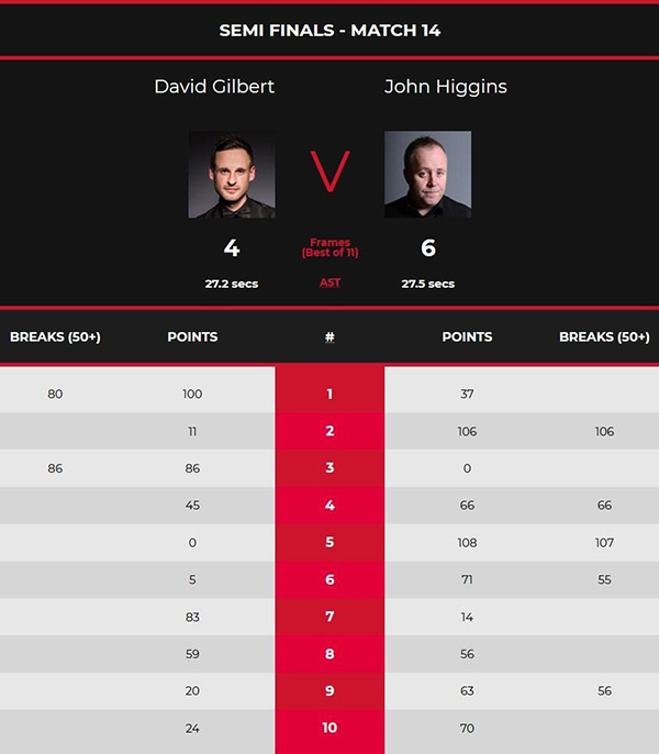 在第七场比赛中,吉尔伯特稳定了局势,并多次赢得83-14。在第八场比赛中,希金斯错过了机会,并输掉了最后的胜利粉红球。吉尔伯特完成了59-56的净空逆转,成功将比分提高到4-4。