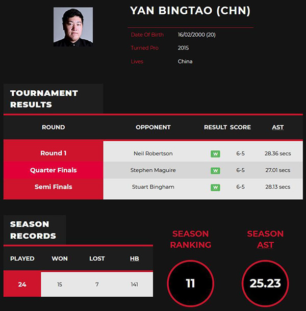 决胜局中,颜丙涛拼进一杆长台上手,连得7分后中袋蓝球出现失误,随后宾汉姆拿下8分后反切底袋红球失误。颜丙涛获得非常好的上手机会,单杆拿下65分超分后中断,随后宾汉姆连得16分后最后一颗红球做斯诺克。颜丙涛被罚掉一杆,随后拼进红球拿下这局,总分6-5颜丙涛连续三场上演绝杀好戏,成功挺进大师赛决赛。