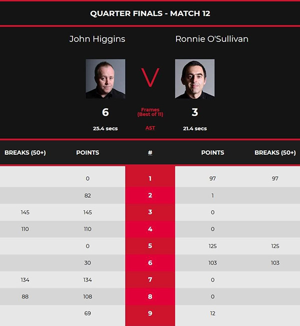 第七局,奥沙利文开球失误,希金斯打进中袋红球上手单杆直接轰出134分以134:0拿下此局取得4-3的领先。第八局,两人的连续破百终于断掉,错失追平单场六杆破百纪录,希金斯先得20分后,一杆得到88分,以108-0零封5-3拿到赛点。
