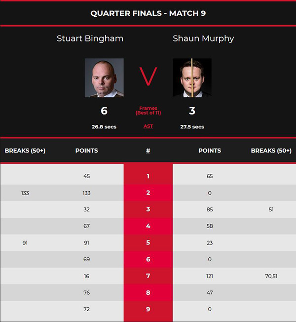 第九局,墨菲长台不进,宾汉姆单杆16分;墨菲拼红球不进,宾汉姆单杆23分防守;墨菲一杆防守失误,宾汉姆单杆20分,翻袋不进;墨菲直接打散红球送上机会,宾汉姆单杆12分,以71-0超12分;墨菲继续努力,宾汉姆拼进红球拿下比赛。